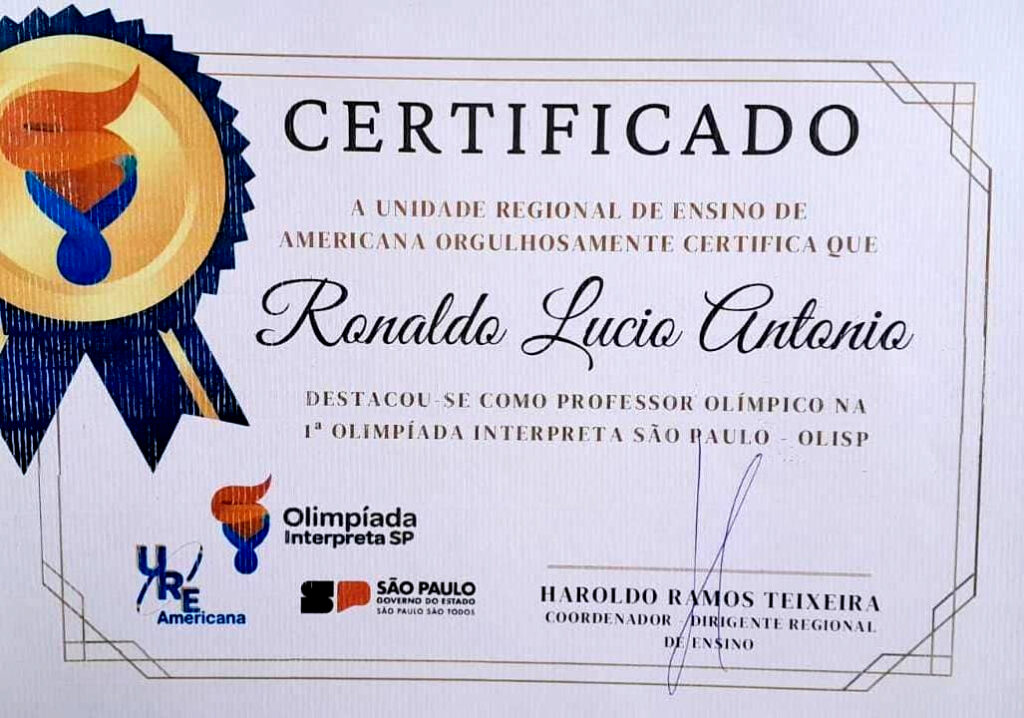 O professor Ronaldo Morenno recebeu, em 2025, a medalha de ouro da OLISP por sua destacada atuação como Professor Olímpico, fortalecendo a leitura e a interpretação de textos na rede estadual paulista.